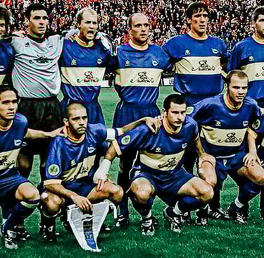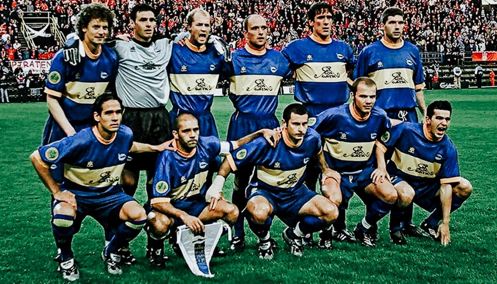 Alineación para el recuerdo del Deportivo Alavés en la histórica final de la Copa de la UEFA disputada contra el poderoso Liverpool F.C. en la que podemos ver a Delfí Geli en la fila superior en primer lugar empezando por la derecha.